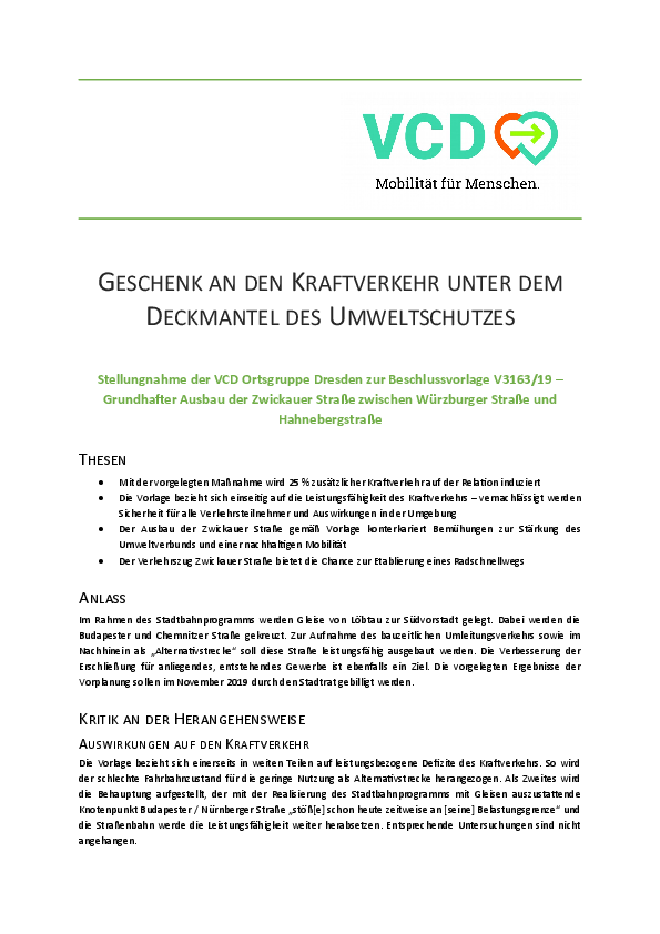 Lesen Sie hier die Stellungnahme der VCD Ortsgruppe Dresden zur Beschlussvorlage V3163/19 –