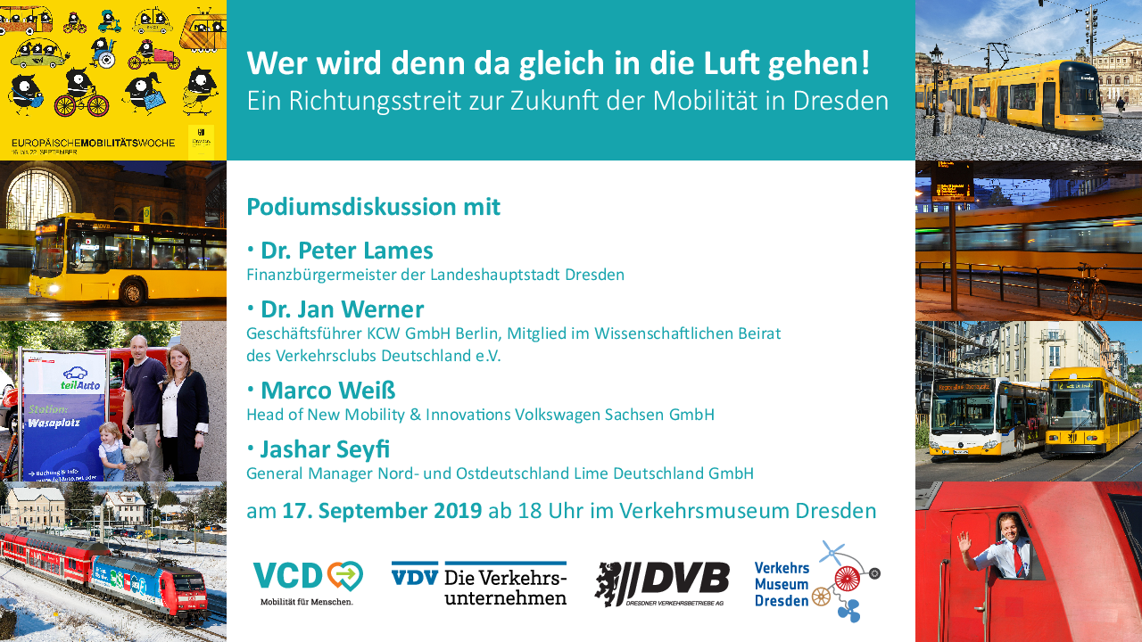 Am Donnerstag, den 19.09.2019, veranstalten wir von 18 bis 20 Uhr im Verkehrsmuseum Dresden zusammen mit dem Verband Deutscher Verkehrsunternehmen (VDV) im Rahmen der Europäischen Mobilitätswoche eine Podiumsdiskussion zur Zukunft der Mobilität in Dresden.
