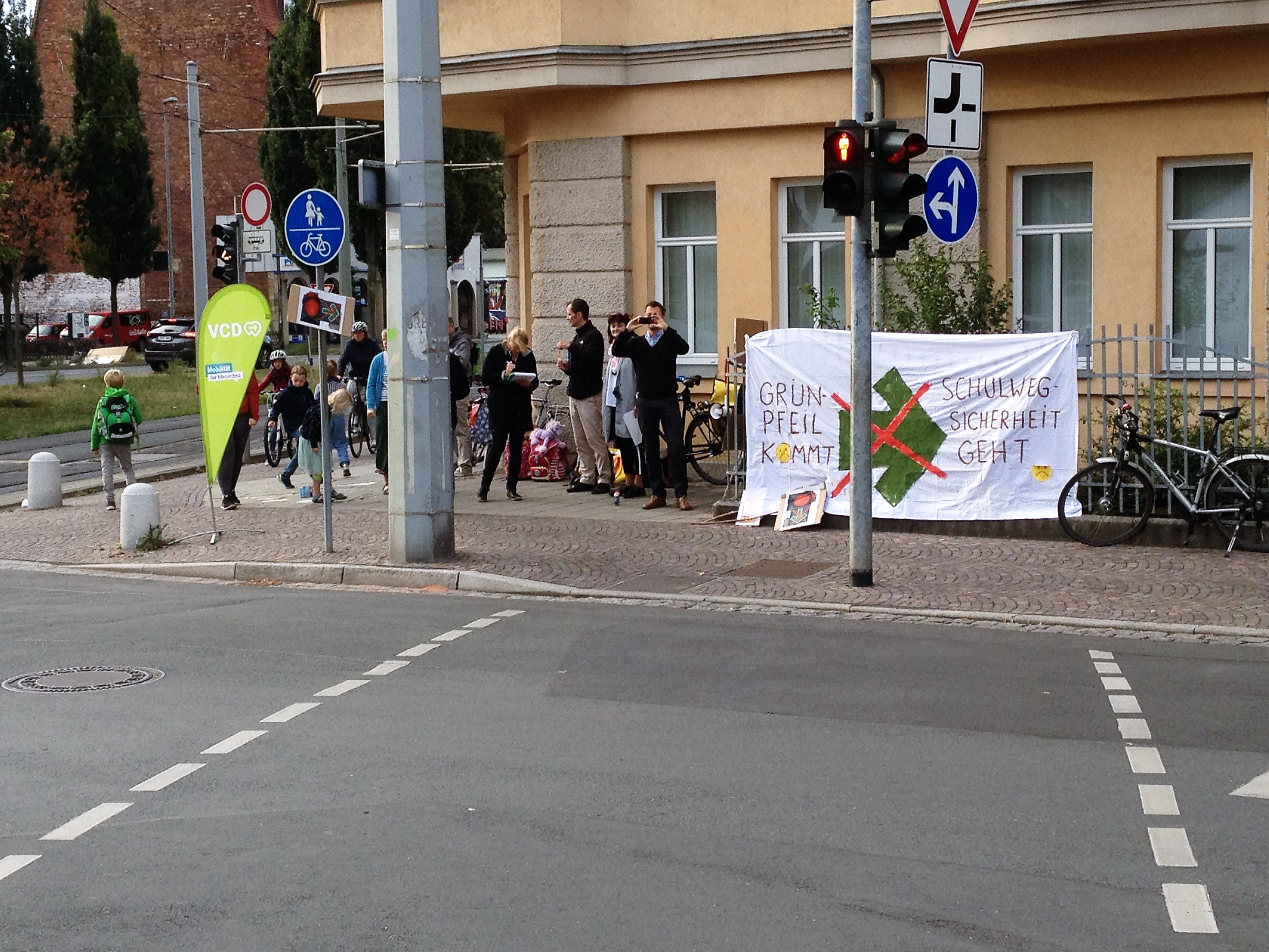 Gemeinsam mit Anwohnerinnen und Anwohnern, Ortsteilräten, Kindern und Eltern der Nordschule führte die VCD Ortsgruppe Jena am 27.08.2018 an der Kreuzung Nollendorfer Hof eine Kundgebung für einen sicheren Schulweg durch.